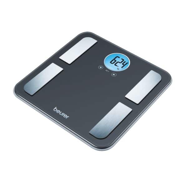 Affichage du poids, de la graisse corporelle, eau corporelle, taux de muscle, calories requises et IMC. 10 mémoires utilisateurs, 5 niveaux d’activité.